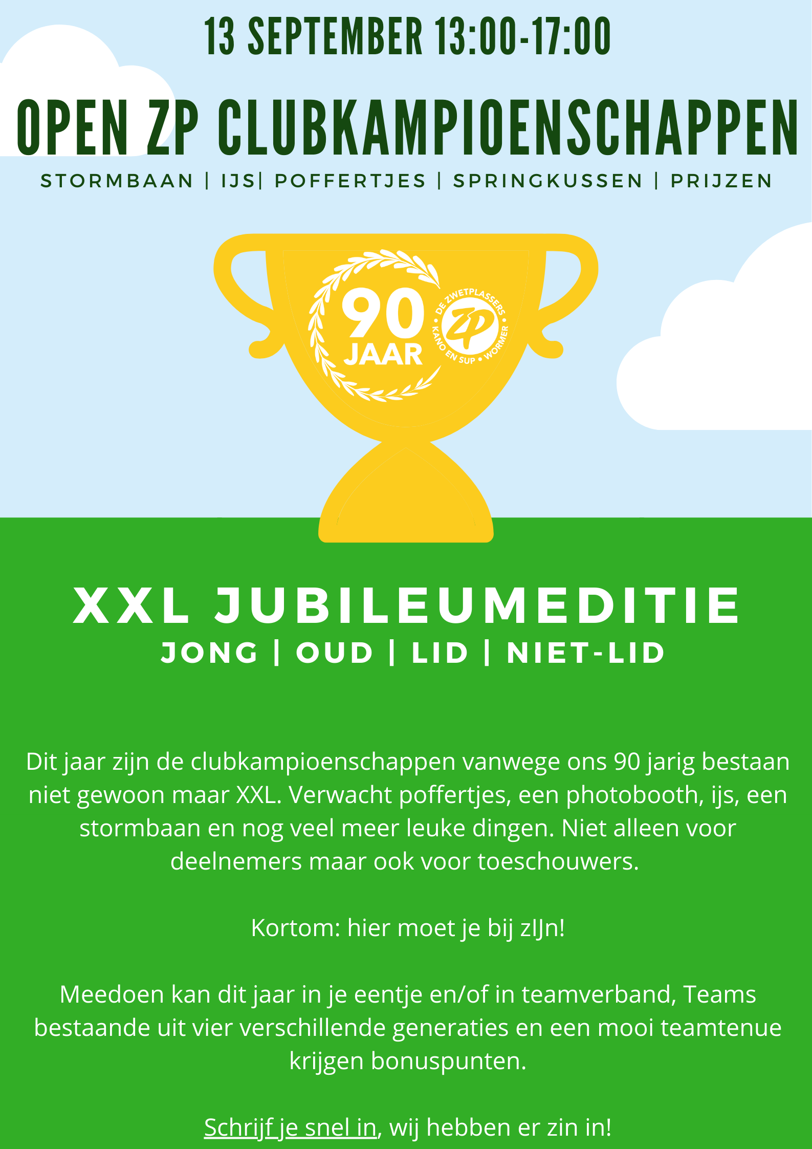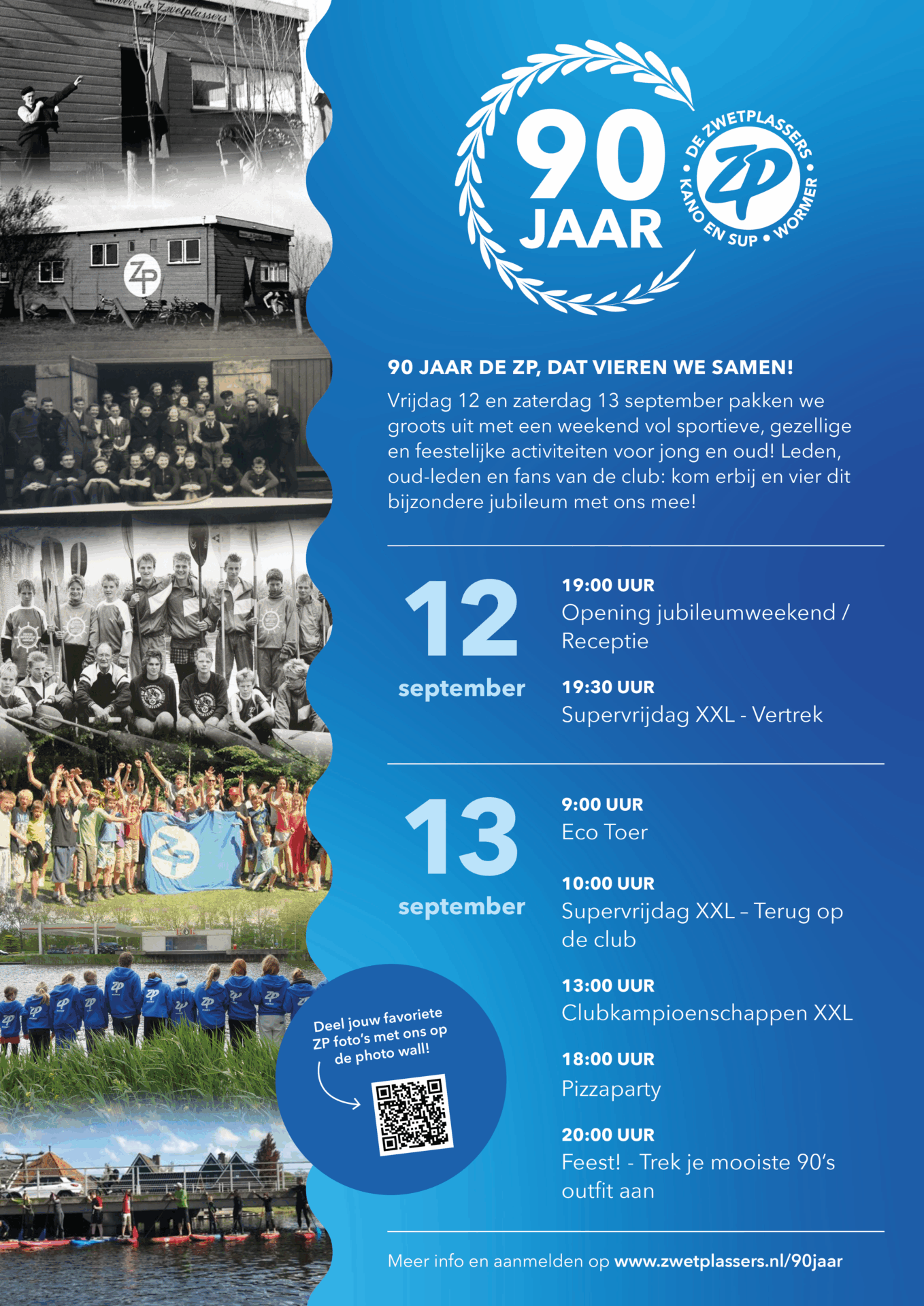 90 jaar De ZP, dat vieren we samen! Vrijdag 12 en zaterdag 13 september pakken we groots uit met een weekend vol sportieve, gezellige en feestelijke activiteiten voor jong en oud! Leden, oud-leden en fans van de club: kom erbij en vier dit bijzondere jubileum met ons mee!